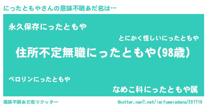 | 男性向けラノベタイトル風あだ名 | 『この素晴らしい世界ににったともやを!』 |