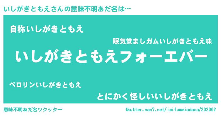 | 胡散臭い通販商品みたいなあだ名 | 『世界が平和になる高級そうな壺…その名も「いしがきともえ」』 |