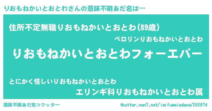 | 欧米人風あだ名 | 『りおもねかいとおとわ・ステッグマイヤー』 |