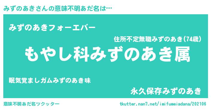 | 男性向けラノベタイトル風あだ名 | 『転生したらみずのあきだった件』 |