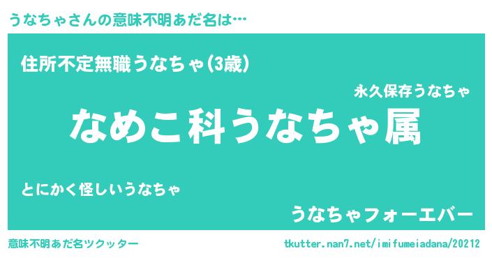 | 女子向けラノベタイトル風あだ名 | 『うなちゃの玉の輿計画!』 |