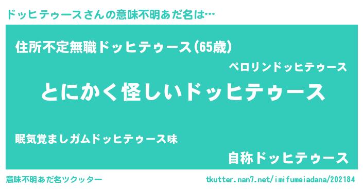 | 男性向けラノベタイトル風あだ名 | 『ドッヒテゥースの嫁は女の子じゃないと思った?』 |