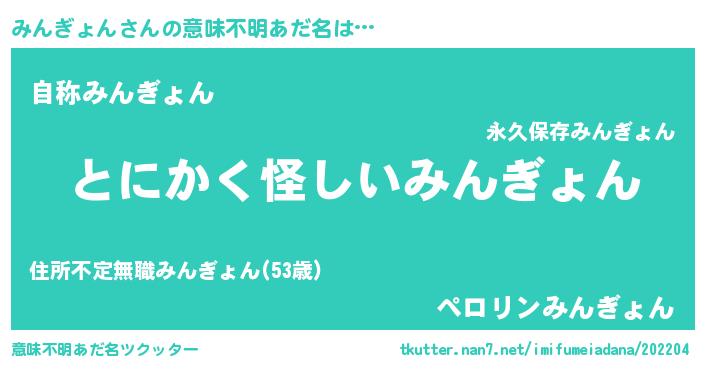 | 男性向けラノベタイトル風あだ名 | 『みんぎょんの嫁は女の子じゃないと思った?』 |