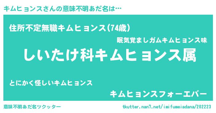 | ヒーロー風カッコイイあだ名 | 『仮面キムダー』『炎刃騎士キム』 |