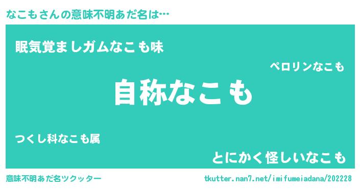 | 男性向けラノベタイトル風あだ名 | 『Re:なこもから始める異世界生活』 |
