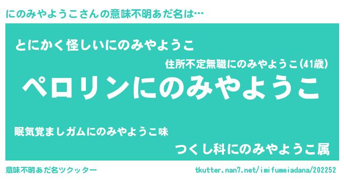 | ポケモン風あだ名 | 『ニノチュウ』『ヒニノミヤヨウコ』 |