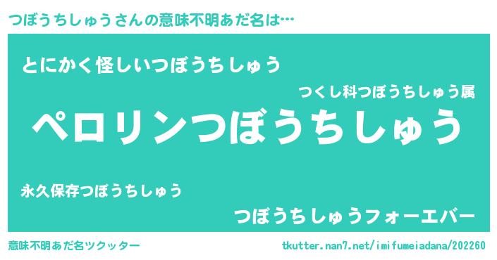 | 男性向けラノベタイトル風あだ名 | 『つぼうちしゅうの憂鬱』 |
