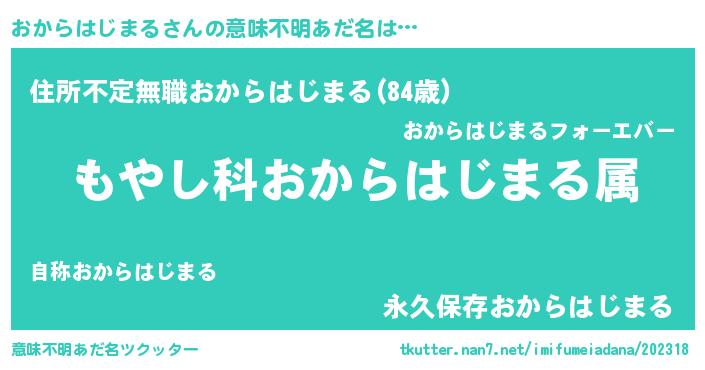 | 男性向けラノベタイトル風あだ名 | 『転生したらおからはじまるだった件』 |