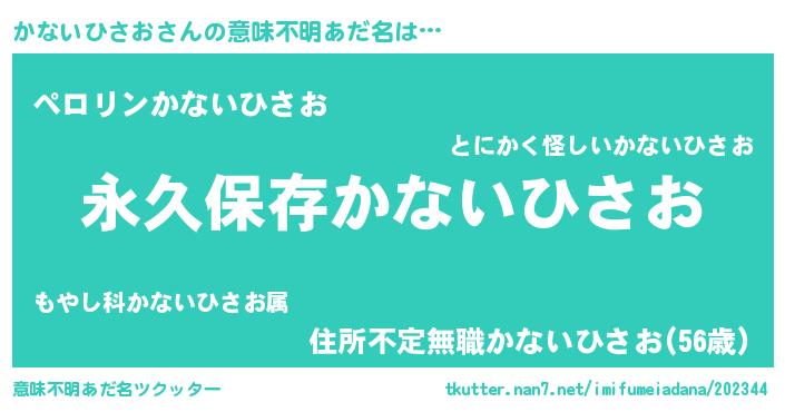 | 男性向けラノベタイトル風あだ名 | 『かないひさおという概念が存在しない退屈な世界 』 |