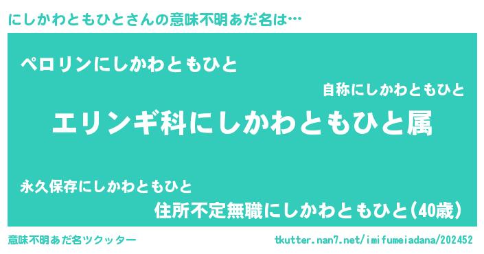 | 男性向けラノベタイトル風あだ名 | 『緋弾のニシカワトモヒト』 |