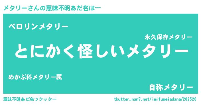 | 男性向けラノベタイトル風あだ名 | 『ダンジョンにメタリーを求めるのは間違っているだろうか』 |