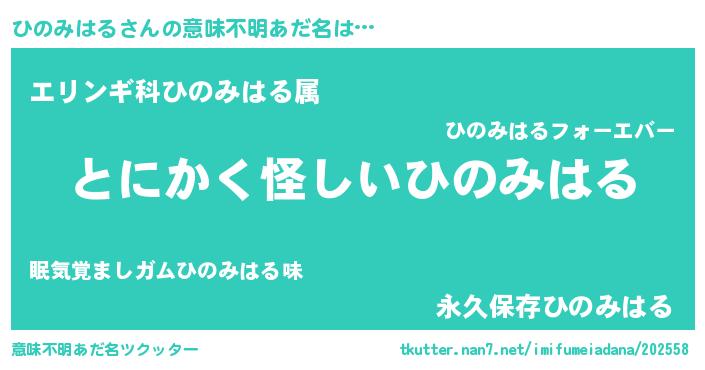 | 男性向けラノベタイトル風あだ名 | 『ひのみはるの嫁は女の子じゃないと思った?』 |