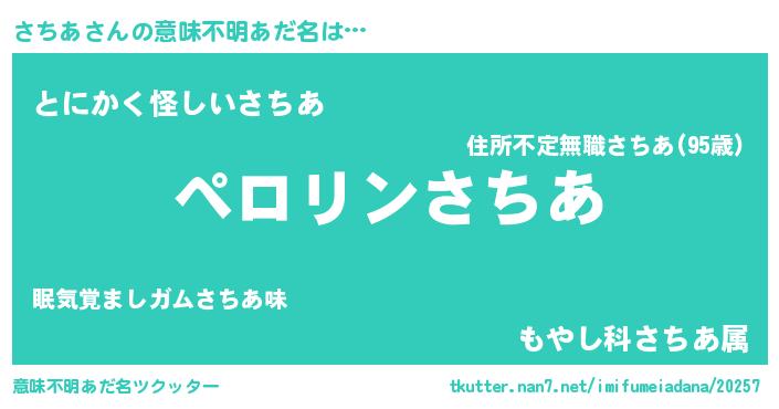 | 胡散臭い通販商品みたいなあだ名 | 『必ず成功するブレスレット…その名も「さちあ」』 |