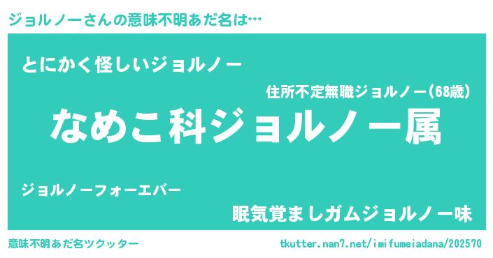 | 男性向けラノベタイトル風あだ名 | 『転生したらジョルノーだった件』 |