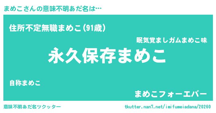 | 女子向けラノベタイトル風あだ名 | 『異世界で失敗しない100のまめこ』 |