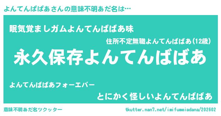 | 男性向けラノベタイトル風あだ名 | 『よんてんばばあという概念が存在しない退屈な世界 』 |