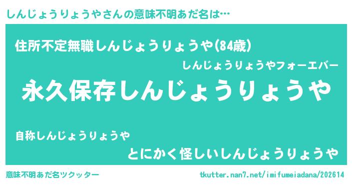 | 胡散臭い通販商品みたいなあだ名 | 『絶対に幸福をもたらす水素水…その名も「しんじょうりょうや」』 |
