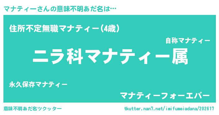 | ヒーロー風カッコイイあだ名 | 『仮面マナダー』『ネオマナティー』 |