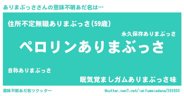 | 男性向けラノベタイトル風あだ名 | 『アリマブッサアートオンライン』 |
