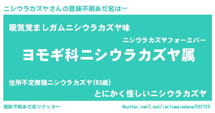 | 男性向けラノベタイトル風あだ名 | 『ニシウラカズヤ~年齢イコール彼女いない歴の魔法使い~』 |