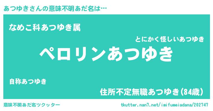 | 男性向けラノベタイトル風あだ名 | 『うちのあつゆきが世界を掌握している!』 |