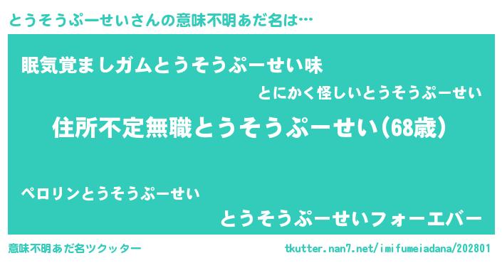 | 男性向けラノベタイトル風あだ名 | 『この素晴らしい世界にとうそうぷーせいを!』 |