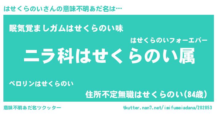 | 男性向けラノベタイトル風あだ名 | 『はせくらのい~年齢イコール彼女いない歴の魔法使い~』 |