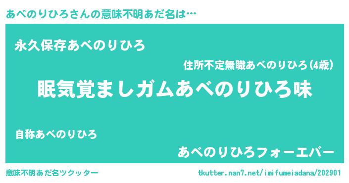 | 男性向けラノベタイトル風あだ名 | 『ノーゲーム・ノーアベノリヒロ』 |