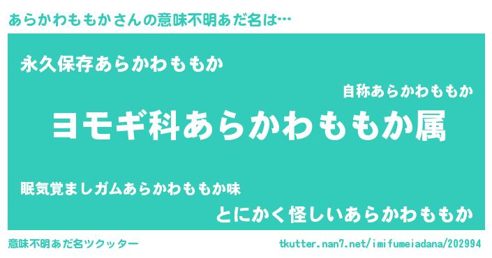 | 胡散臭い通販商品みたいなあだ名 | 『前代未聞の健康食品…その名も「あらかわももか」』 |