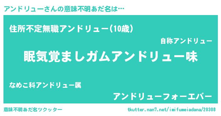 | 男性向けラノベタイトル風あだ名 | 『うちのアンドリューが世界を掌握している!』 |