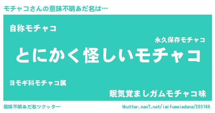 | 男性向けラノベタイトル風あだ名 | 『モチャコの嫁は女の子じゃないと思った?』 |