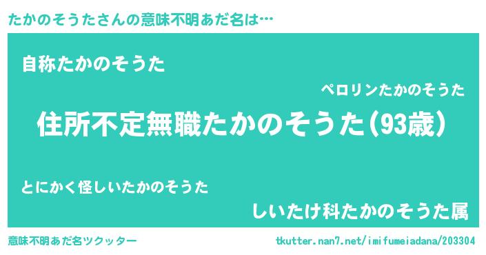 | 男性向けラノベタイトル風あだ名 | 『この素晴らしい世界にたかのそうたを!』 |