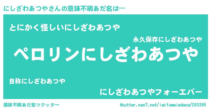 | 男性向けラノベタイトル風あだ名 | 『ニシザワアツヤアートオンライン』 |