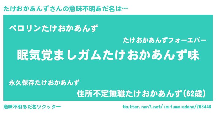| 男性向けラノベタイトル風あだ名 | 『たけおかあんずに滅ぼされるだけの簡単なお仕事です』 |