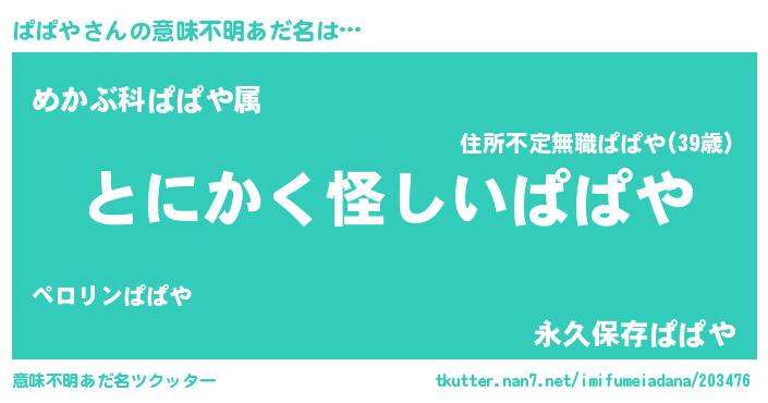| 男性向けラノベタイトル風あだ名 | 『ぱぱやの嫁は女の子じゃないと思った?』 |