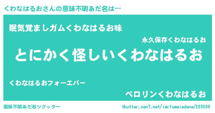 | 男性向けラノベタイトル風あだ名 | 『ダンジョンにくわなはるおを求めるのは間違っているだろうか』 |
