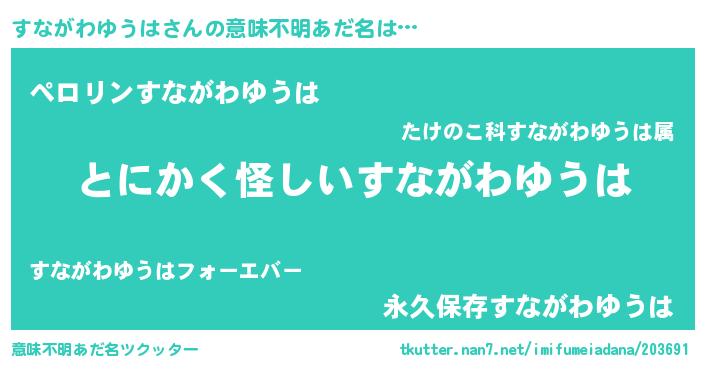 | 胡散臭い通販商品みたいなあだ名 | 『信頼と実績のサプリメント…その名も「すながわゆうは」』 |