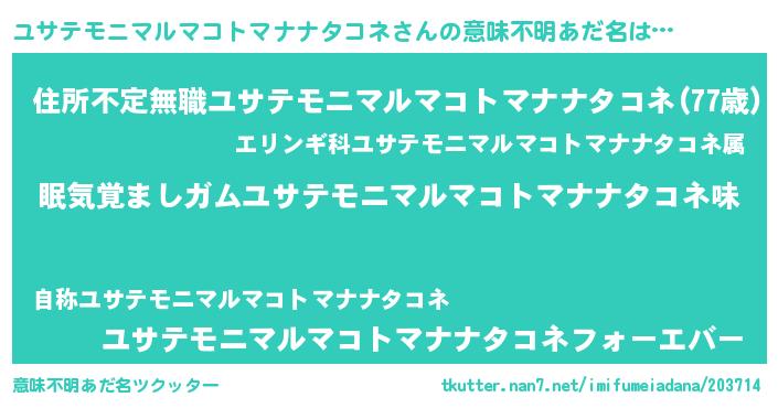 | 男性向けラノベタイトル風あだ名 | 『ノーゲーム・ノーユサテモニマルマコトマナナタコネ』 |