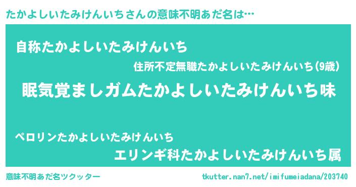 | 男性向けラノベタイトル風あだ名 | 『ノーゲーム・ノータカヨシイタミケンイチ』 |