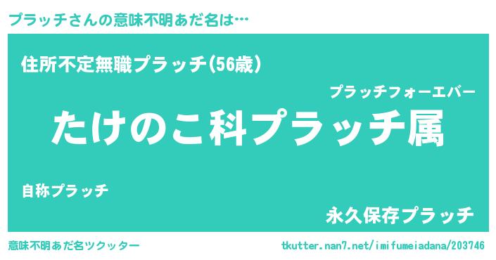 | 男性向けラノベタイトル風あだ名 | 『転生したらプラッチだった件』 |
