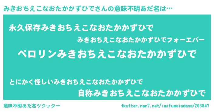 | 女子向けラノベタイトル風あだ名 | 『シンデレラみきおちえこなおたかかずひで家の靴箱館』 |
