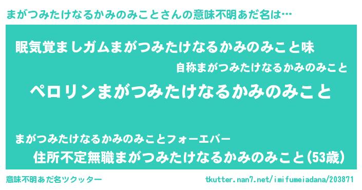 | 恥ずかしいあだ名 | 『プリティーまがつみたけなるかみのみこと』 |