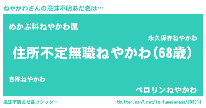 | 男性向けラノベタイトル風あだ名 | 『魔弾の王とねやかわ』『ねやかわの憂鬱』 |
