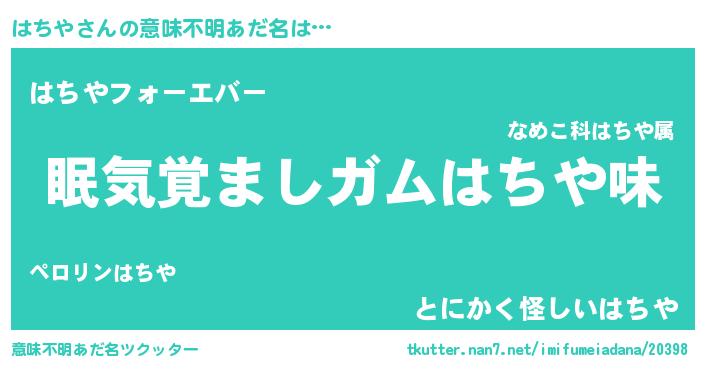 | 男性向けラノベタイトル風あだ名 | 『おまえをオタクにしてやるから、俺をはちやにしてくれ! 』 |
