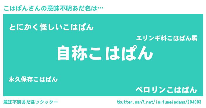 | 欧米人風あだ名 | 『アンジェラ・こはぱん』 |