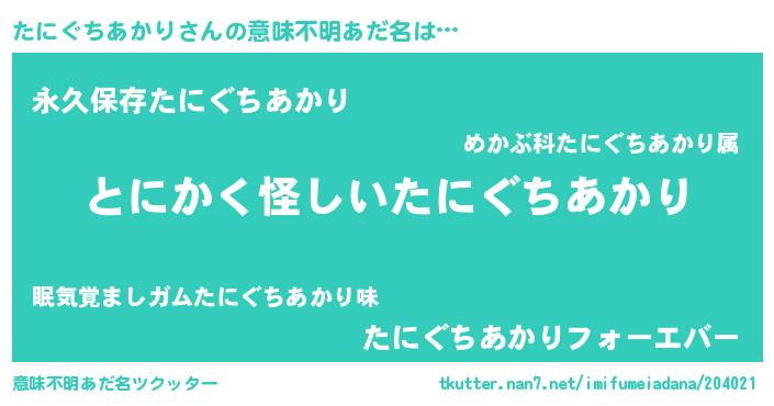 | 女子向けラノベタイトル風あだ名 | 『たにぐちあかりの卵を拾いまして』 |