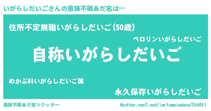 | 男性向けラノベタイトル風あだ名 | 『Re:いがらしだいごから始める異世界生活』 |