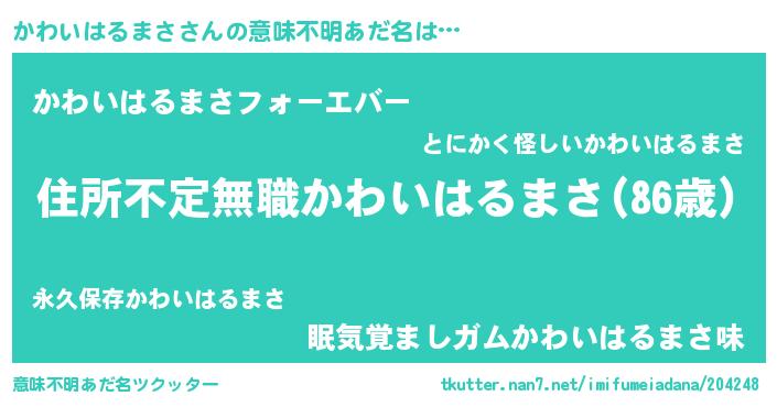 | 女子向けラノベタイトル風あだ名 | 『かわいはるまさが死なない童話 林檎のかわいはるまさの診療簿』 |
