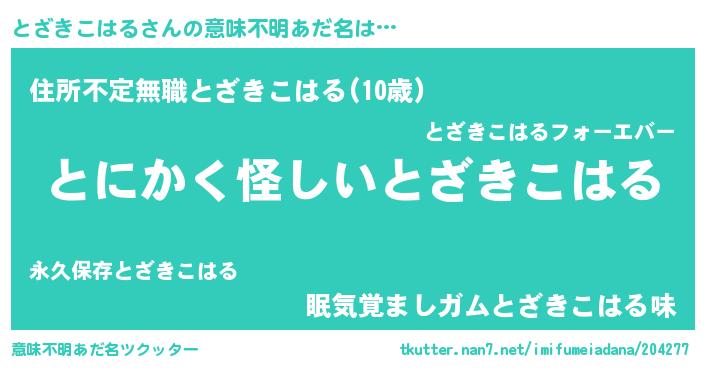 | 男性向けラノベタイトル風あだ名 | 『とざきこはるの嫁は女の子じゃないと思った?』 |