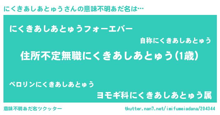 | 男性向けラノベタイトル風あだ名 | 『にくきあしあとゅうに滅ぼされるだけの簡単なお仕事です』 |